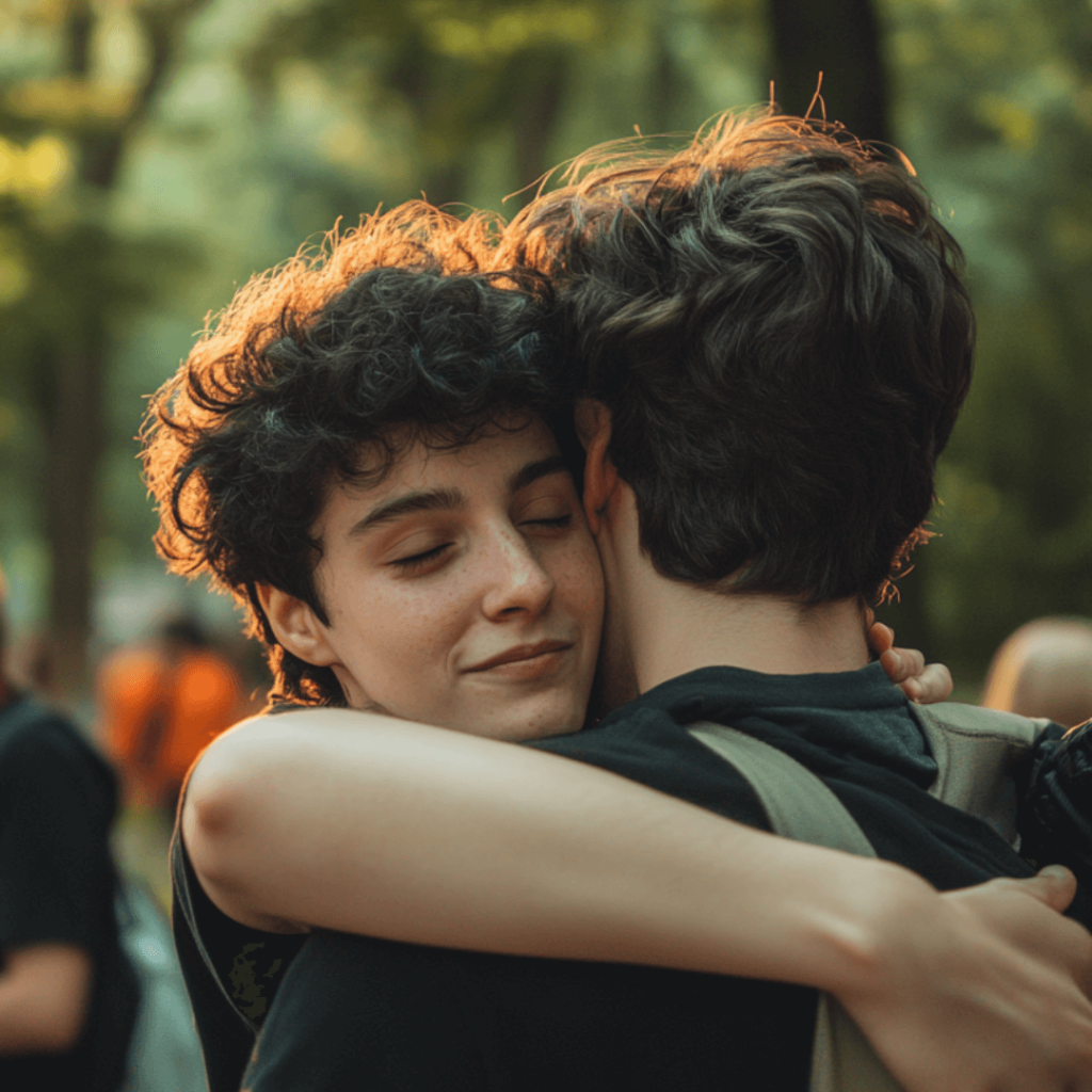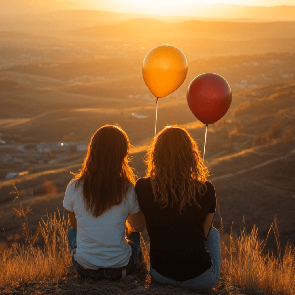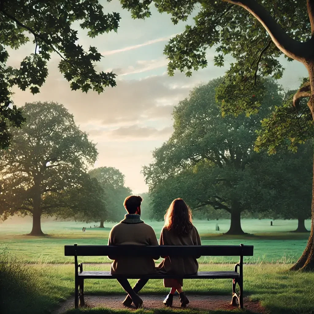 Na ławce w parku, pod rozłożystym drzewem, dwójka przyjaciół w milczeniu obserwuje zachód słońca, który maluje niebo odcieniami różu, złota i pomarańczy. Wieczór powoli otula świat ciszą i spokojem, a oni kontemplują to, co niewidoczne.
